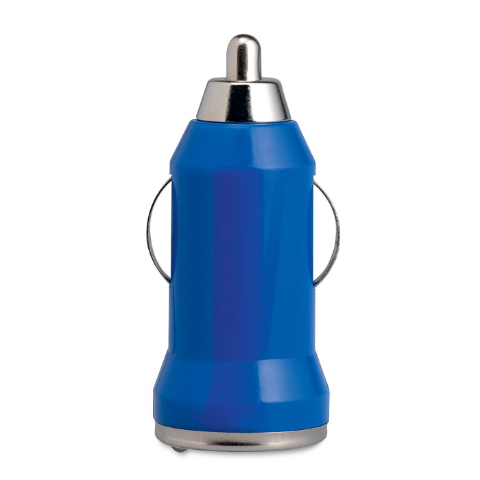 Samochodowa ładowarka USB z czerwoną lampką - wskaźnikiem ładowania. ABS i stop aluminium. Srebrne kartonowe pudełko.