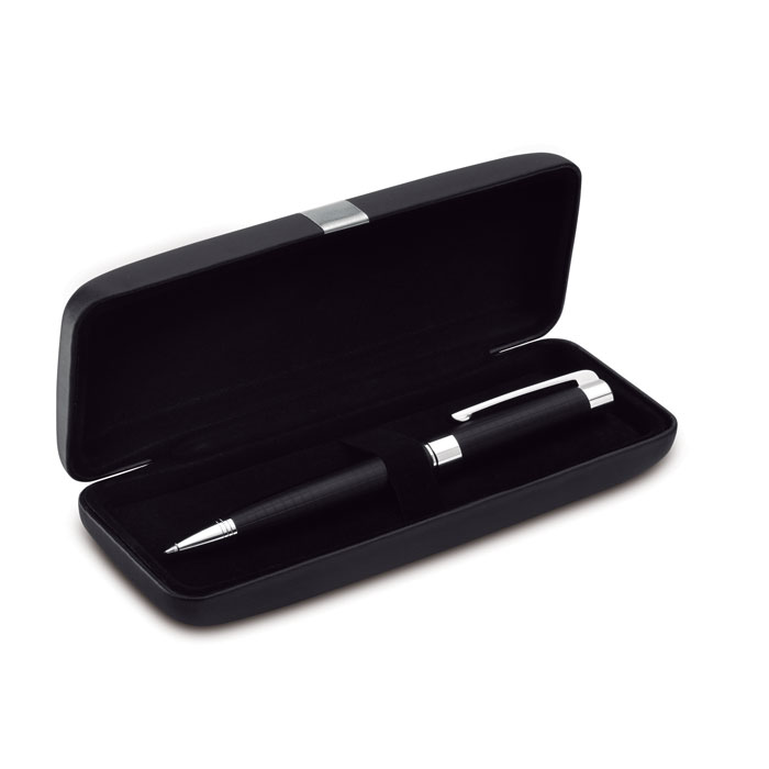 Metalowy przekręcany długopis z satynowym szachowym wzorem. Niebieskim wkład. Pudełko z PU z metalową opaską.