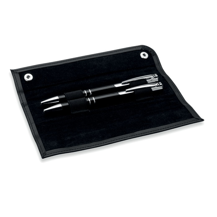 Zestaw piśmienniczy w etui z PU składający się z przyciskanego, aluminiowego długopisu oraz automatycznego ołówka. Niebieski wkład.