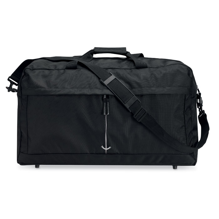 Torba podróżna lub sportowa z dużą przednią kieszenią i ozdobnymi dekoracjami na zewnątrz. Wykonana z grubego poliestru 1680D.