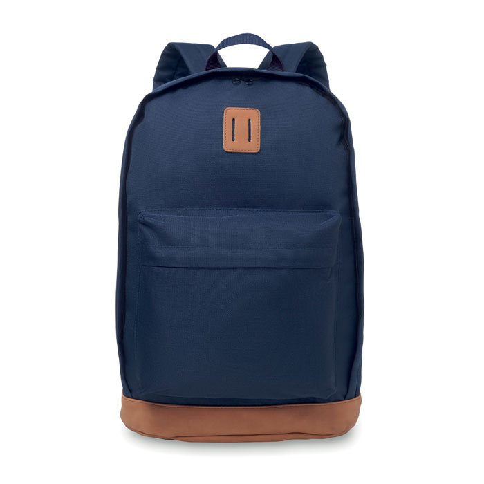 Plecak z poliestru 1000D z zewnętrzną kieszenią na zamek błyskawiczny i wstawkami z ekoskóry. Na górze zapinana na zamek kieszonka.